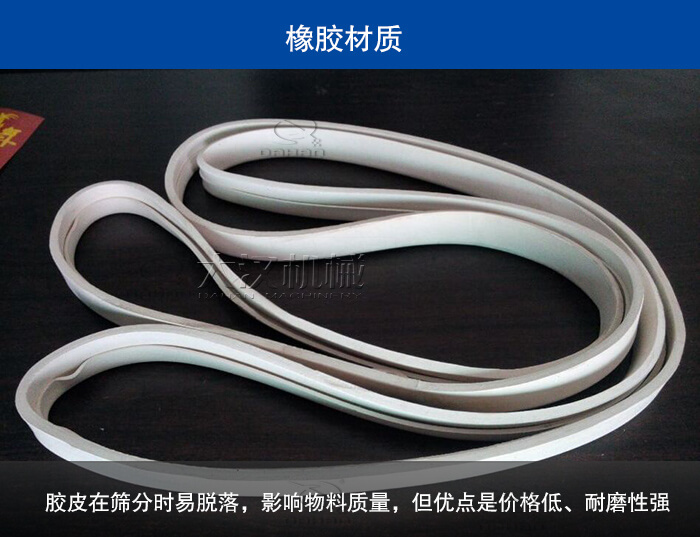 橡膠材質(zhì)的密封件中使用廣泛,,但在食品、化工類行業(yè)使用較少,因?yàn)橄鹉z本身對(duì)于物料會(huì)有一定的污染成分,膠皮在篩分時(shí)易脫落,會(huì)嚴(yán)重影響物料質(zhì)量,但其價(jià)格低、耐磨性強(qiáng),用戶在購(gòu)買振動(dòng)篩應(yīng)根據(jù)物料的不同要求安裝合適的密封件。