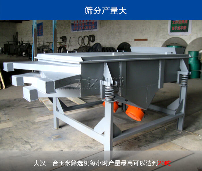 針對(duì)玉米篩選行業(yè)而言,對(duì)我們篩選機(jī)的產(chǎn)量是有要求的,大漢生產(chǎn)的玉米篩選機(jī)采用雙電機(jī)驅(qū)動(dòng),設(shè)備激振力大,而且我們的玉米篩選機(jī)加裝分料器,能有效的利用直線(xiàn)振動(dòng)篩篩面面積,能使物料均勻分布在篩面上,大大提升物料篩分精度與蟬聯(lián),據(jù)實(shí)驗(yàn)證明,大漢一臺(tái)玉米篩選機(jī)每小時(shí)產(chǎn)量高可以達(dá)到20噸。