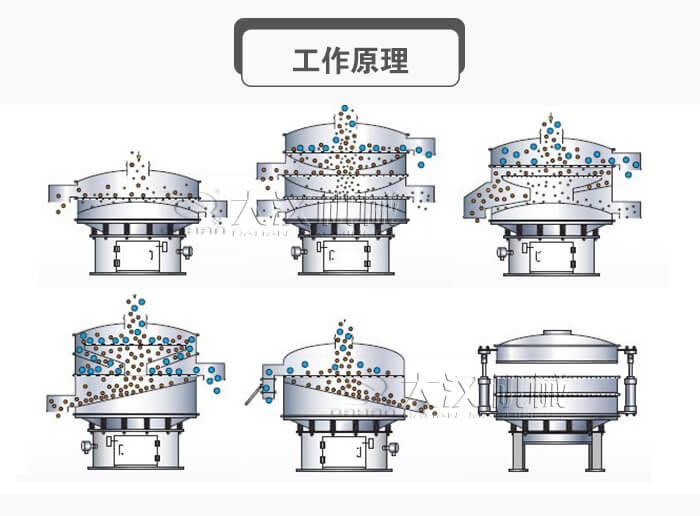 粉末振動篩主要由進料口、防塵蓋、出料口、束環、篩網、配重塊、上部重錘、振動體、振動電機、彈簧、下部重錘、機座等部分組成。