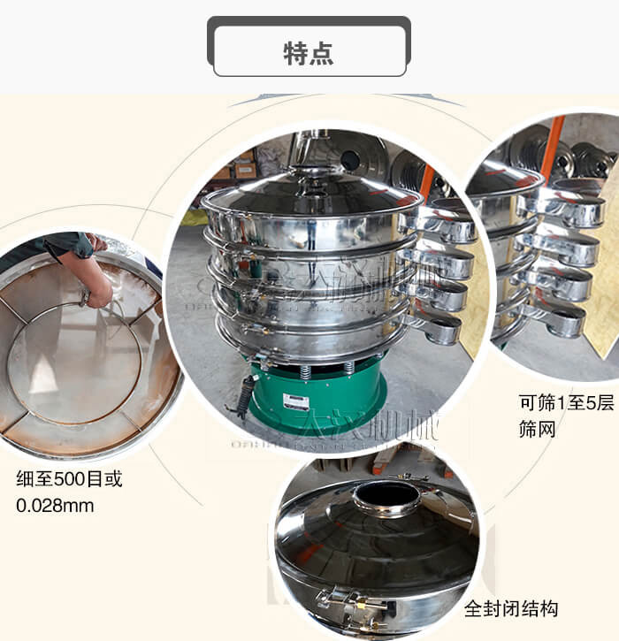 粉末振動篩作為一種高精度細粉篩分設備,又叫粉末旋振篩,化工粉末振動篩,其篩粉精度高,全密閉結構,可以保證粉末在篩分過程中出現粉塵污染,加裝彈跳球、超聲波等請網裝置,可以減少粉末因比重強、含水量高等造成的堵網現象。我們的粉末振動篩在機身與物料接觸部分均采用304不銹鋼材質,機座部分則采用普碳鋼材,也可根據客戶的要求設計成304不銹鋼材質,既可以單層除雜、多層分級、也可固液分離過濾使用,篩面層數1-5層,可分2-6個出料口,篩分精度高、效率高。